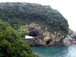 ウミガメで有名な美波町(旧日和佐町)にある浸食洞です。大きな岩山に、幅32メートル、高さ31メートルの穴がぽっかりと空いています。徳島県では最大の浸食洞とのことです。