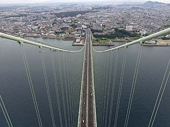 とある事情により、明石海峡大橋の主塔に登ってきました。天気が曇天だったのが残念ですが、晴天なら暑くて暑くて、すぐに降りたくなるそうです。そういう意味では、快適な空中散歩でした。ちなみに、「とある事情」自体には大反対です(分かる人にしか分からん?)。