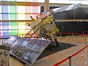 あかし市民広場(パピオスあかし)で開催中の、「特別公開1『はやぶさ2』in明石」の展示を見に行ってきました。小惑星りゅうぐうに着陸し、先日地球に岩石片を持ち帰った「はやぶさ2」の原寸大模型が展示されています。一瞬、「な〜んだ、本物じゃないんだ」と思ったりしましたが、本物はまだ宇宙にあって、次のミッションに入っていますから、地球上に本物の「はやぶさ2」があるはずがありません。大きさだけでなく、いろんな機構が実物そっくりに再現されています。再突入カプセルのカットモデルも展示されていました。50年前に、大阪の万博のアメリカ館に2時間ほど並んで見た「月の石」を思い出しました。